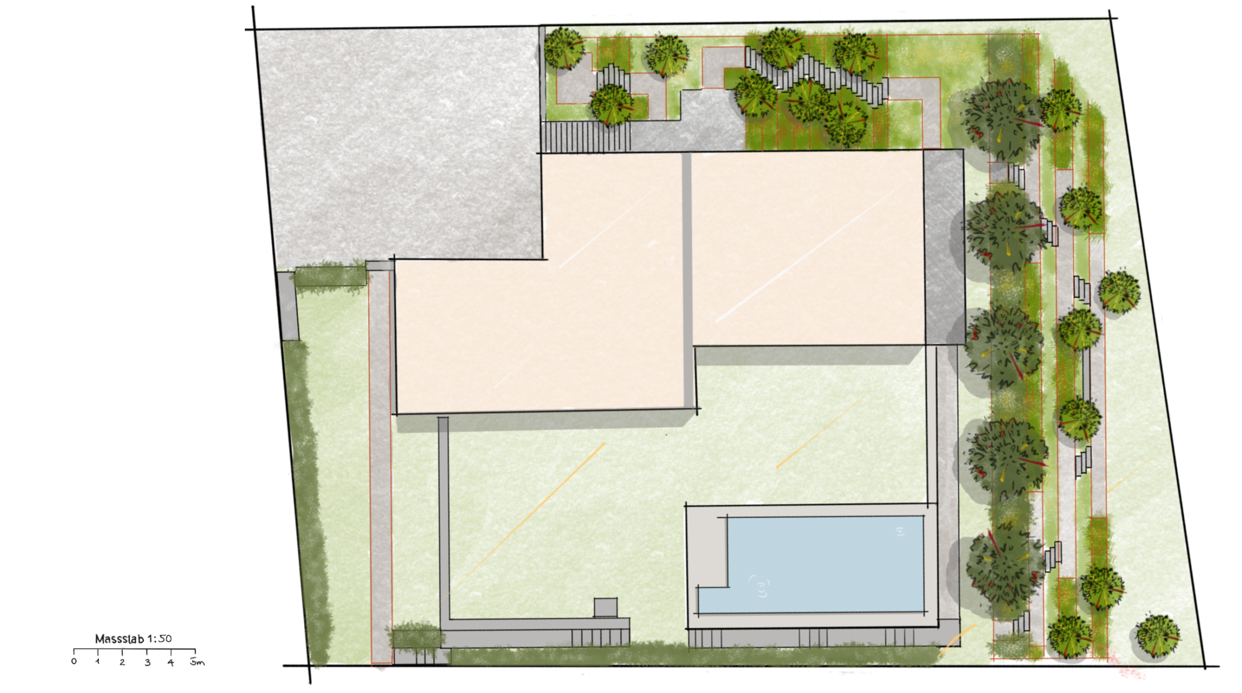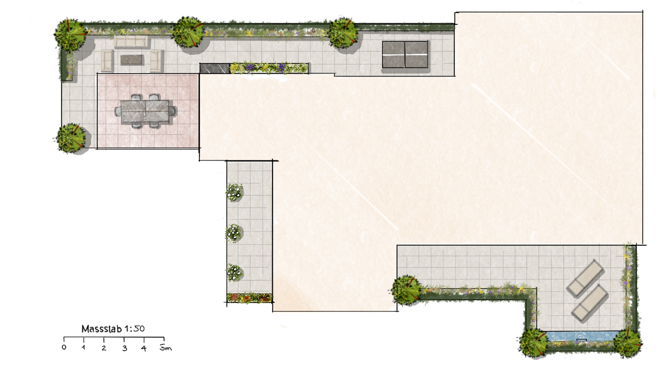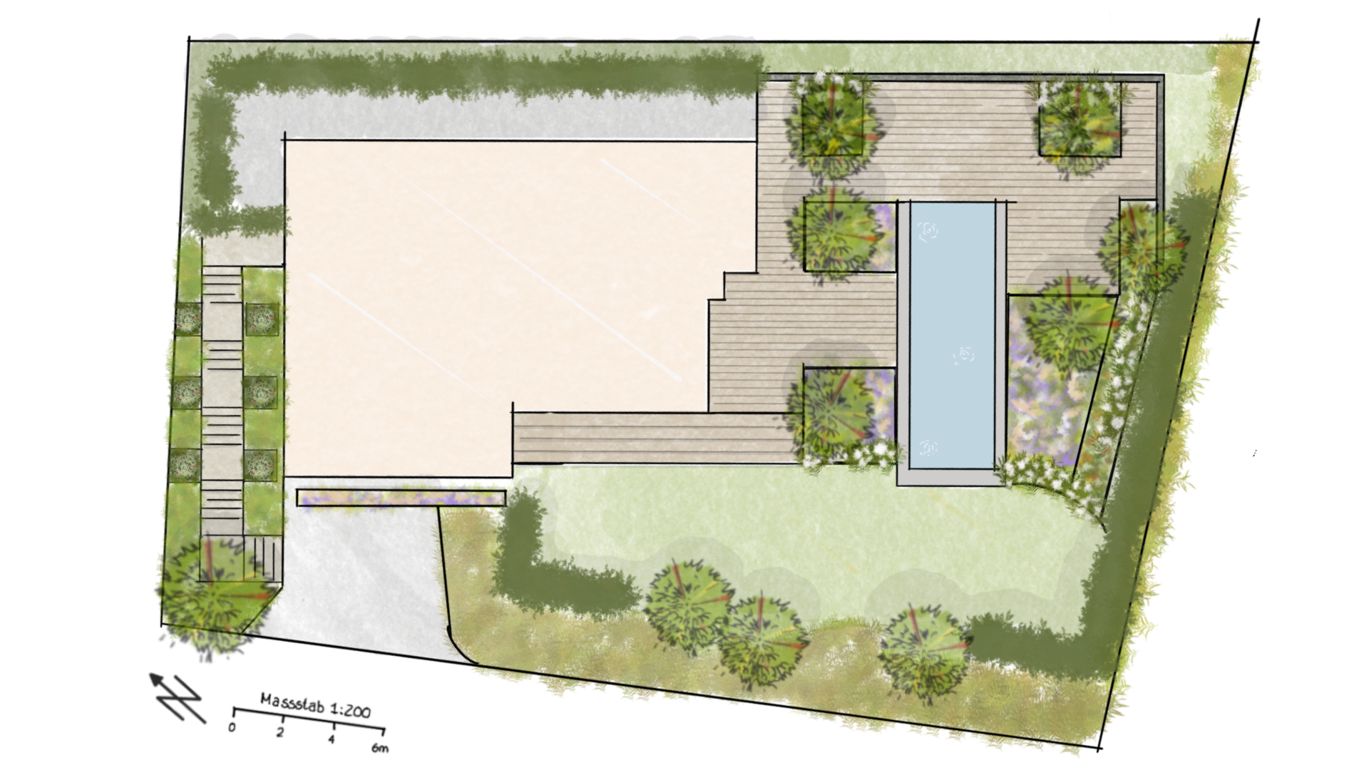 Nun beginnt die Entwicklung eines stimmigen Gesamtkonzepts. Von der Raumaufteilung über die Materialisierung bis hin zur durchdachten Pflanzenauswahl. Gemeinsam erarbeiten wir ein Design, das auf Ihre Vorstellungen und Bedürfnisse abgestimmt ist.